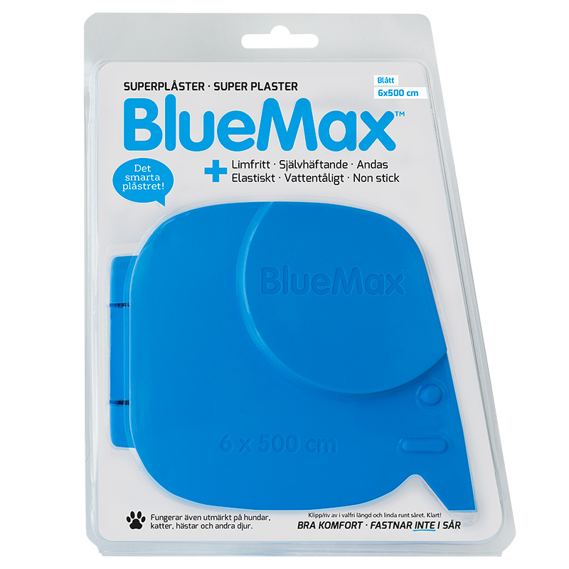 BlueMax Superplåster är ett limfritt och självhäftande plåster som är elastiskt och inte fastnar i hår, på hud eller i sår. Plåstret fäster i sig självt när du virar det runt t ex fingret. BlueMax plåster andas och är vattentåligt. Plåstret kommer i en hållare och du river av en så lång bit du behöver. Kan även användas på hundar, katter, hästar och andra djur.