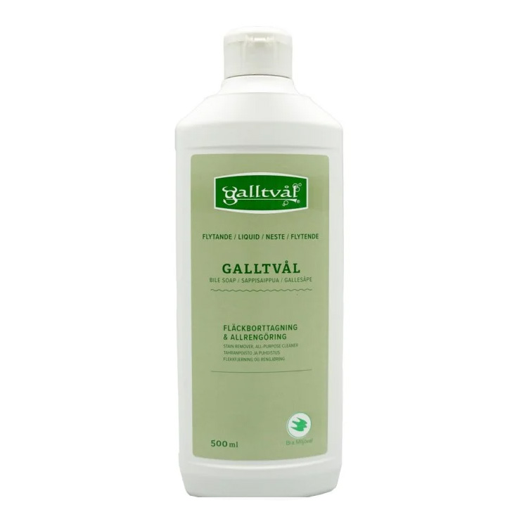 Galltvåls flytande rengörings- och fläckborttagningstvål är en helt naturlig tvål som passar för all sorts rengöring. Galltvålen innehåller bland annat oxgalla och klorofyll som är effektiva mot olja, fett, fläckar från gräs, bär, frukt och grönsaker. Oxgalla är ett beprövat, naturligt ämne för att få bort fettfläckar från plagg.