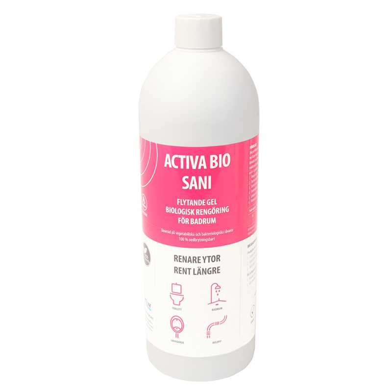 Den högkoncentrerade gelprodukten fäster bra även på vertikala ytor såsom väggar och toaletter. Produkten är förstärkt med tensider från BIOSURF®-process som är 500 gånger effektivare än traditionella tensider. Produkten har en kalkhämmande effekt. ACTIVA BIO SANI är en 6-i-1 produkt som ger en effektiv och komplett rengöring.