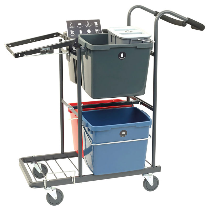 Flexibel källsorteringsvagn med sex fraktioner i varierande storlek. Hållare för 125L säck, 4 x 25L backar färgkodade och 12L kärl med lock anpassat för matavfall. Karta med märkning i form av informativa pictogram medföljer. Vagnen kan enkelt byggas ut med tre fraktioner till (artnr 29286) eller kompletteras med våtutrustning för städ (artnr 29287).