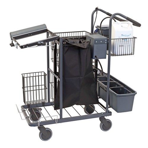 En smart designad sprayvagn med extra stor materialkorg. Plats för tre stativ. Drivs av ett laddningsbart batteri och med ett enkelt knapptryck impregnerar du snabbt och effektivt dina moppar med Z-Water.