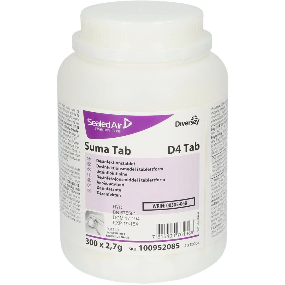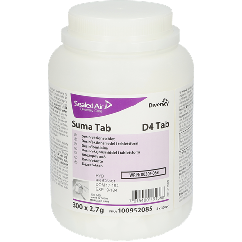 Suma Tab D4 är en koncentrerad tablett för desinfektion för alla slags ytor. En tablett per 10 liter vatten motsvarar 150 ppm aktivt klor.