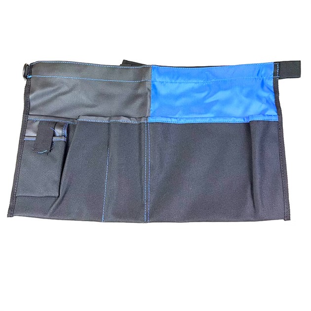 Ett blå/svart midjebälte med fickor för dukar och moppar.